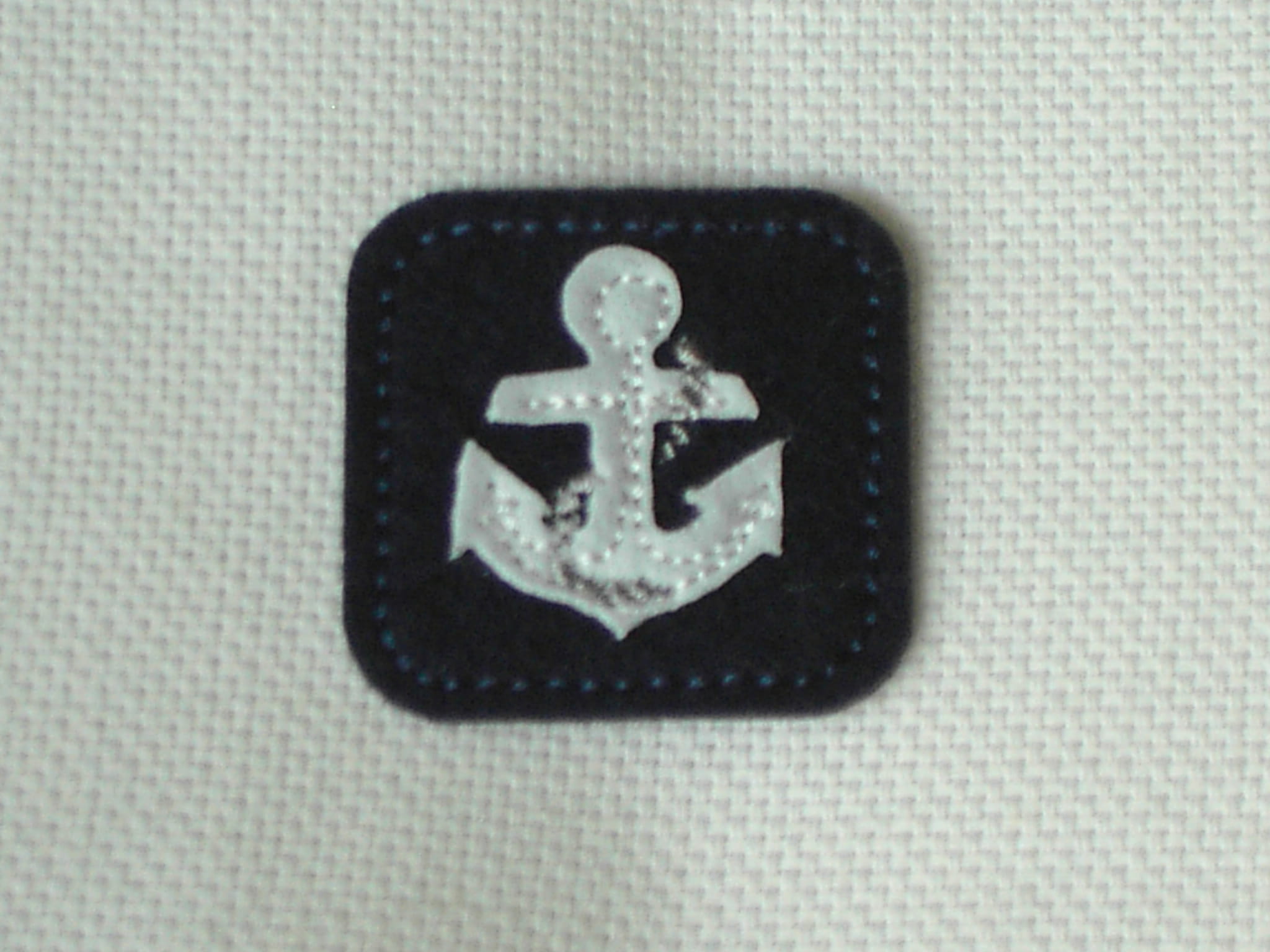 Granatowe tło, biała kotwica, szara nić przeszycia.