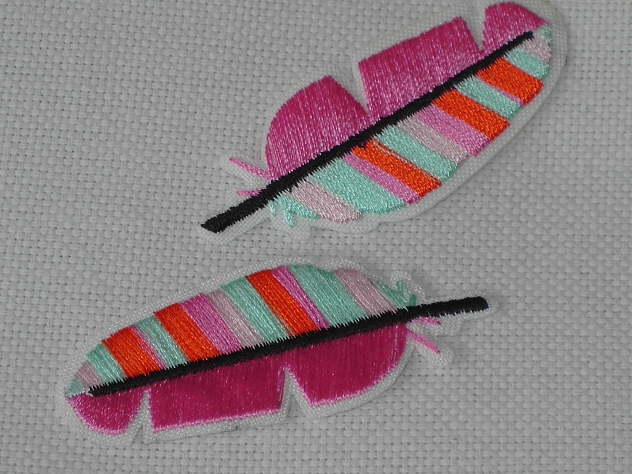 Aplikacja termo. Aplikacja haftowana, w kształcie stylizowanego, ptasiego pióra. Kolor róże, pomarańcz, mięta, czarny.
