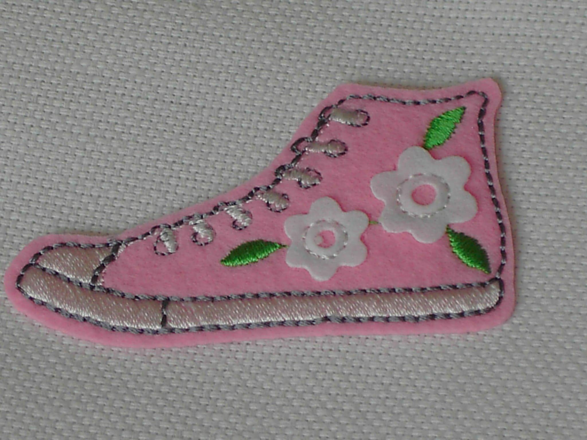 Kształt trampka w kolorze różowym, elementy białe i zielone.