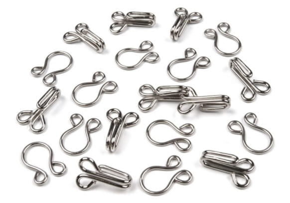 Metalowe haftki w kolorze srebrnym. Komplet składa się z oczka i haczyka.