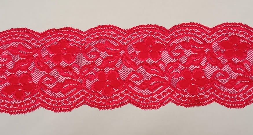 Koronka elastyczna, rozciągliwa, o szerokości 96 mm, w kolorze soczysto malinowym - różowo-czerwona.
