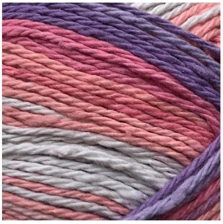 Nitka puszysta, lekko skręcona. Włóczka wielokolorowa: odcienie różu, lila, krem.