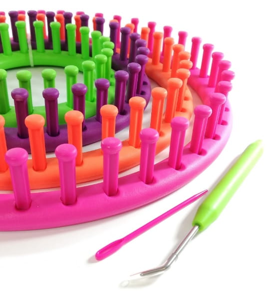 W zestawie 4 obręcze dziewiarskie o średnicy 14cm, 19cm, 24cm, 29cm oraz igła i szydło dziewiarskie.