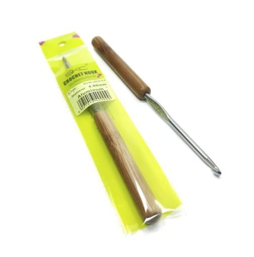 Szydełko aluminiowe, z bambusową rączką. Rozmiar wybity na metalowej części.