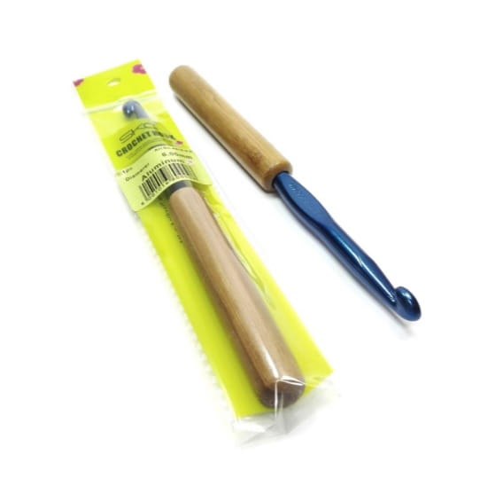 Szydełko aluminiowe, z bambusową rączką. Rozmiar wybity na metalowej części.