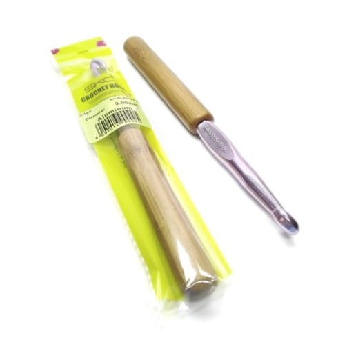 Szydełko aluminiowe, z bambusową rączką. Rozmiar wybity na metalowej części.