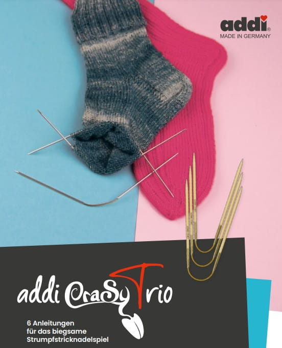 ADDI CraSy Trio Short to metalowe druty na żyłce o długości 21 cm. Posiadają krótką żyłkę, usytuowaną na środku drutów, która umożliwia zginanie się. Dzięki temu 3-częściowemu zestawowi drutów dziewiarskich można bardzo łatwo robić na drutach projekty o naprawdę małej średnicy. W przypadku przerabiania na okrągło, oczka są rozłożone na dwóch drutach, a trzeci drut służy do przerabiania oczek - co oznacza tylko dwie zmiany drutów w rzędzie. Szczególnie przydadzą się przy dzierganiu skarpetek i mankietów.