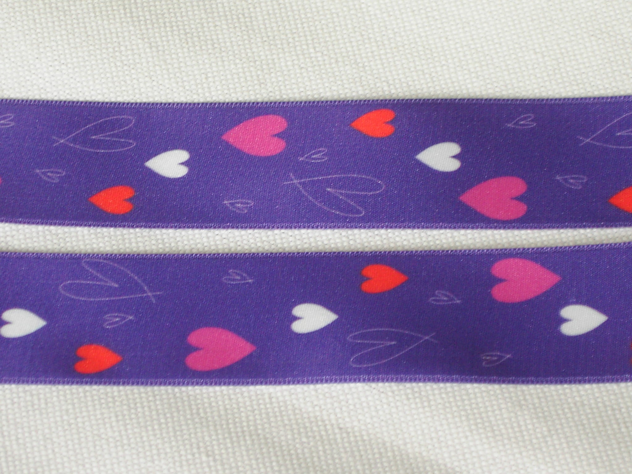 Wstążka poliestrowa, satynowa, drukowana. Wzór: białe, czerwone, różowe serca na fioletowym tle.